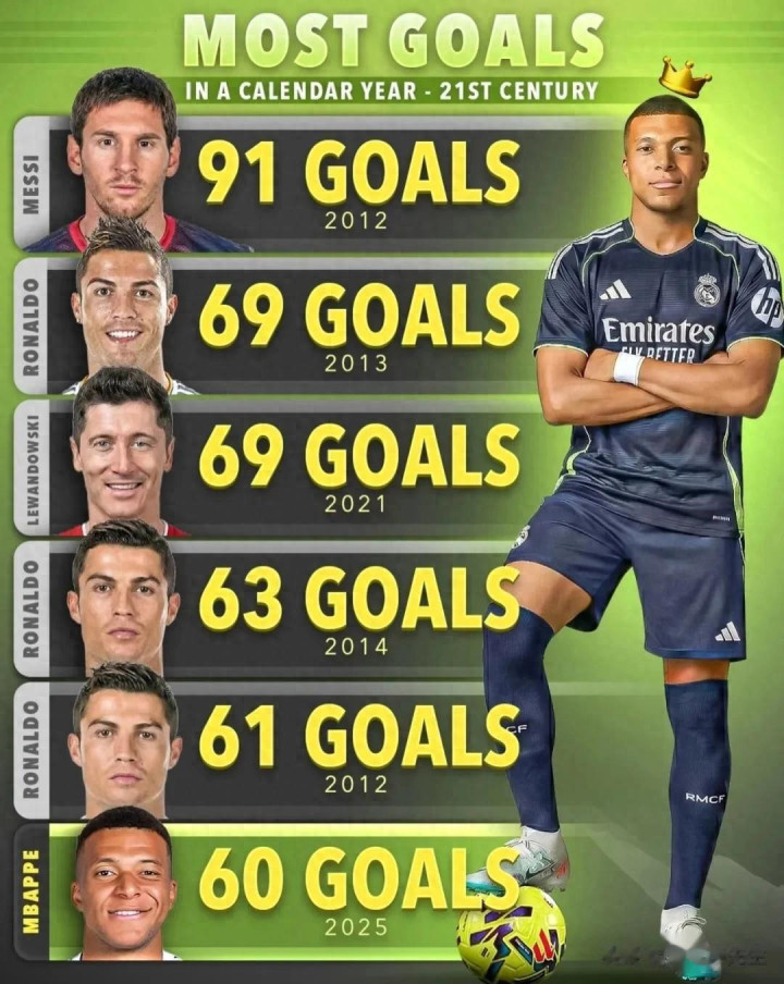 而如今,姆巴佩有望超越C罗的位置。截至目前,2025年姆巴佩前11个月已经打进60球,所以接下来的一个月,5场比赛,姆巴佩只需要10个球,就能坐实这个位置。