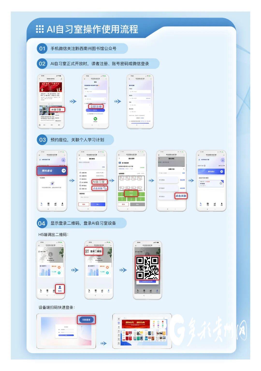 黔西南州图书馆读者服务部主任何漫琳介绍说:“建设前期,我们邀请大量读者进行资源需求调研,了解他们的意愿、预约通道、阅读体验等,持续改进服务。我们支持线上预约、时间选择、扫码签到,实时显示座位占用情况。桌面的智能终端可调节灯光、连接Wi-Fi、查询馆藏资源。智能化学习辅助,AI系统自动推送相关书籍、学术讲座等个性化资源。”